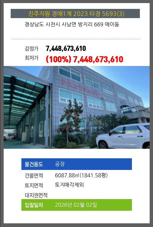 | 용도 | 공장 | 채권자 | 유** | 감정가 | 7,448,673,610 |