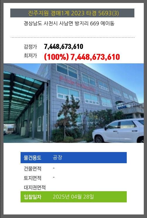 사천공장경매 사천시 사남면 방지리 669 에이동 №2023 타경 5693(3)