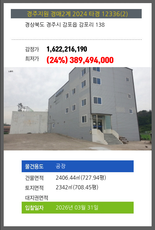 | 건물면적 | 2406.44㎡ (727.94평) | 채무자 | ㈜** | 최저가 | (24%) 389,494,000 |