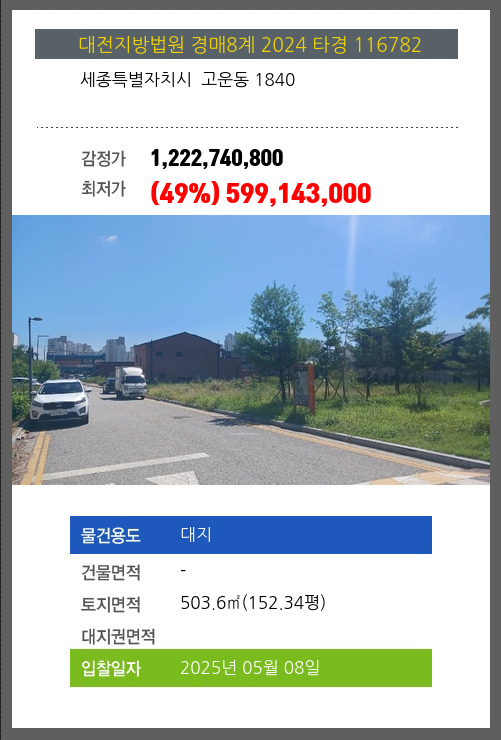 | 토지면적 | 503.6㎡ (152.34평) | 소유자 | 김**외1명 | 보증금 | (10%) 59,914,300 |