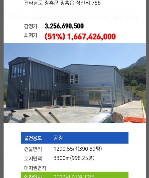 | 건물면적 | 3416㎡ (1033.34평) | 채무자 | 호** | 최저가 | (100%) 3,656,752,700 |
