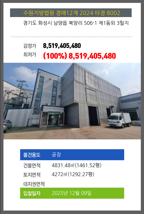 | 건물면적 | 4831.48㎡ (1461.52평) | 채무자 | 제** | 최저가 | (100%) 8,519,405,480 |