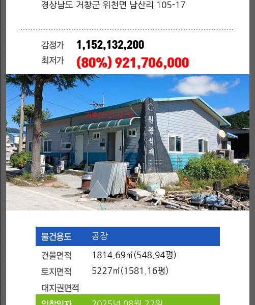 | 건물면적 | 1820.7㎡ (550.76평) | 채무자 | ㈜** | 최저가 | (100%) 1,767,812,380 |