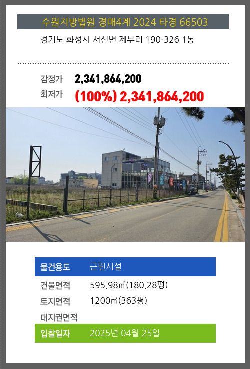 | 건물면적 | 595.98㎡ (180.28평) | 채무자 | 이** | 최저가 | (100%) 2,341,864,200 |
