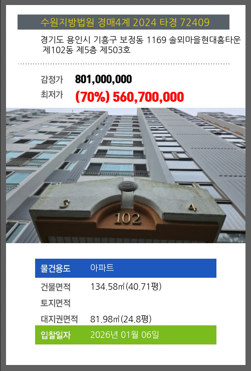 본건은 경기도 용인시 기흥구 보정동 1169 솔뫼마을현대홈타운 제102동 제5층 제503호