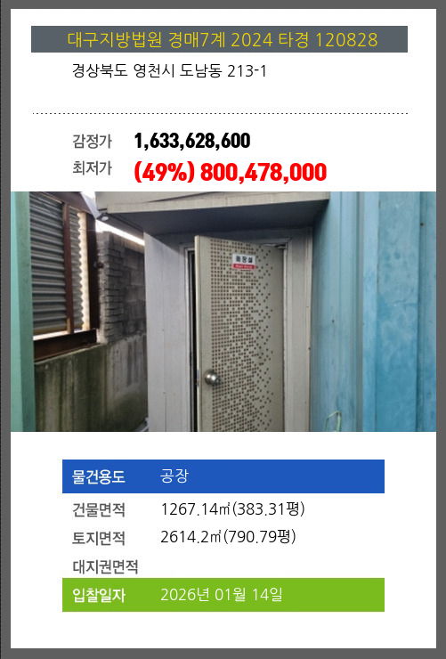 영천공장경매 영천시 도남동 213-1 №2024 타경 120828