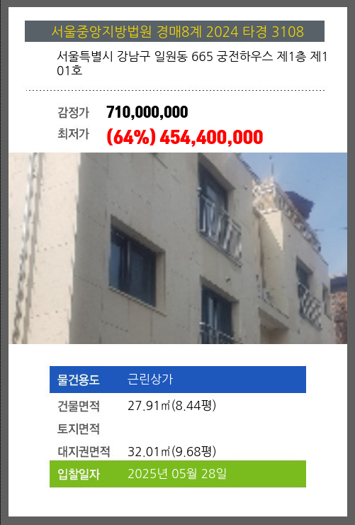 | 건물면적 | 27.91㎡ (8.44평) | 채무자 | 광** | 최저가 | (64%) 454,400,000 |