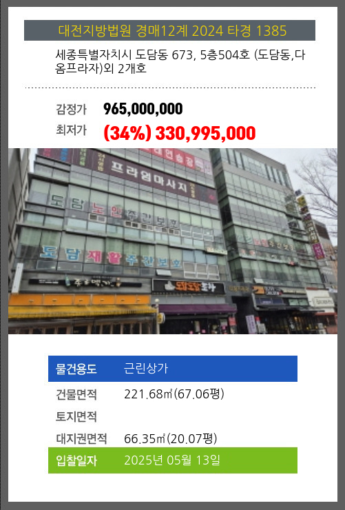| 소재지 | [지번] 세종특별자치시 도담동 673, 5층504호 (도담동,다옴프라자)외 2개호 [도로명 주소] 세종특별자치시 보듬3로 8-21, 5층504호 (도담동,다옴프라자) |