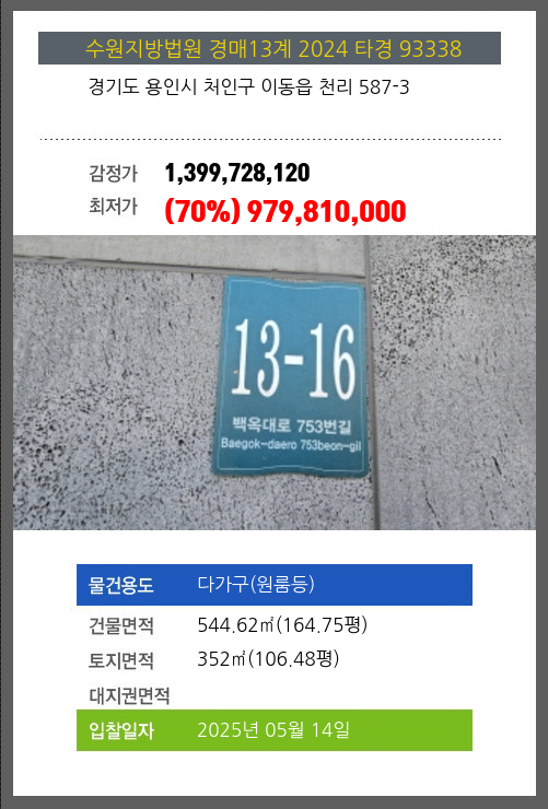 | 건물면적 | 544.62㎡ (164.75평) | 채무자 | 이** | 최저가 | (70%) 979,810,000 |