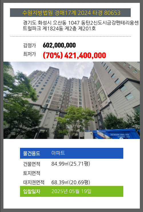 | 대지권 | 68.39㎡ (20.69평) | 소유자 | 김** | 보증금 | (10%) 42,140,000 |