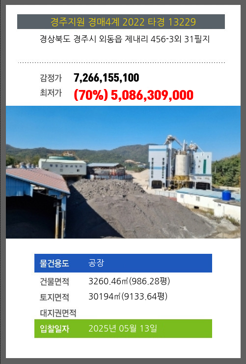 | 용도 | 공장 | 채권자 | ㈜**외2명 | 감정가 | 7,266,155,100 |