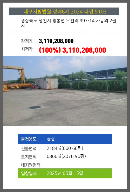 | 건물면적 | 2184㎡ (660.66평) | 채무자 | 이** | 최저가 | (100%) 3,110,208,000 |