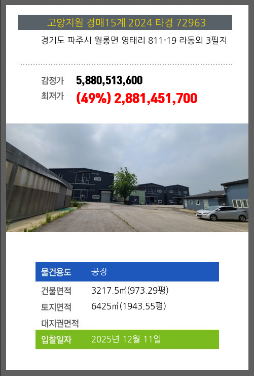 | 소재지 | [지번] 경기도 파주시 월롱면 영태리 811-19 라동외 3필지 [도로명 주소] 경기도 파주시 월롱면 공수물길 230-28 라동외 3필지 |
