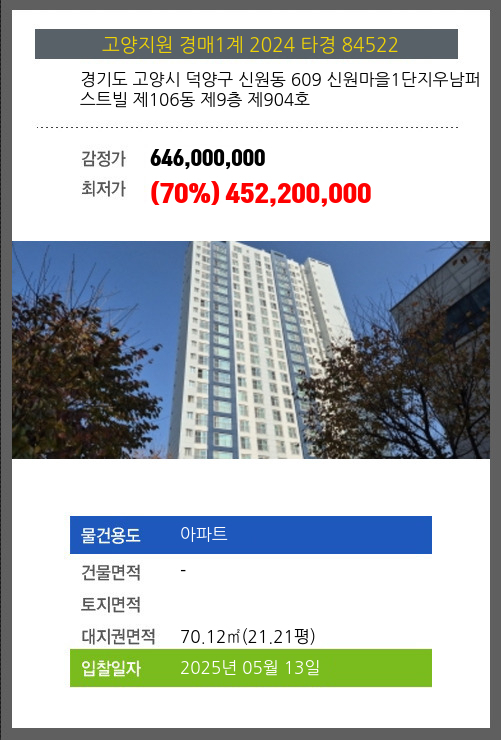 대지권 70.12㎡ (21.21평) 소유자 정** 보증금 (10%) 45,220,000