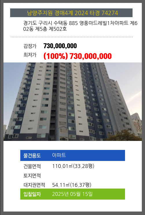 구리아파트경매 구리시 수택동 885 영풍마드레빌1차아파트 제602동 제5층 제502호 №2024 타경 74274
