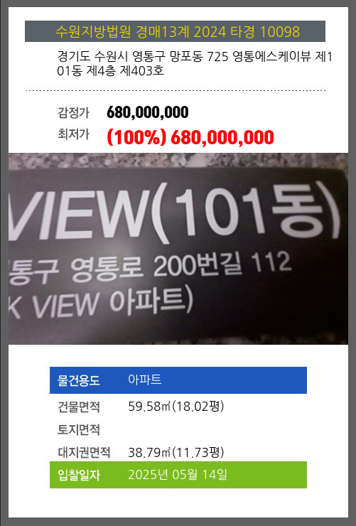 본건은 경기도 수원시 영통구 망포동 725 영통에스케이뷰 제101동 제4층 제403호