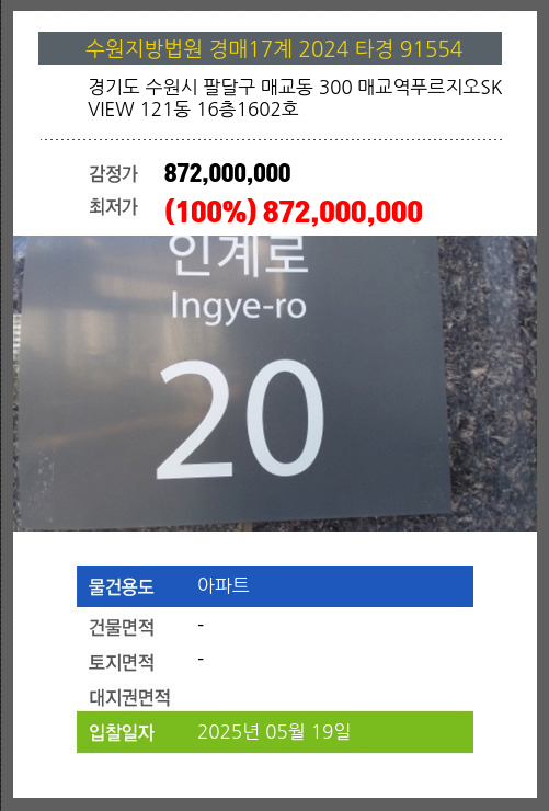| 소재지 | [지번] 경기도 수원시 팔달구 매교동 300 매교역푸르지오SK VIEW 121동 16층1602호 [도로명 주소] 경기도 수원시 팔달구 인계로 20, 매교역푸르지오SK VIEW 121동 16층1602호 |