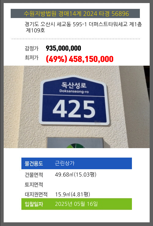 본건은 경기도 오산시 세교동 595-1 더퍼스트타워세교 제1층 제109호