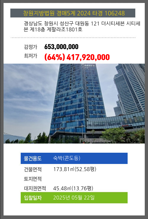 창원숙박(콘도등)경매 창원시 성산구 대원동 121 더시티세븐 시티세븐 제18층 제팔라조1801호 №2024 타경 106248