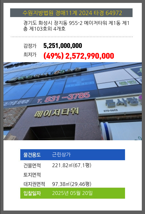| 건물면적 | 221.82㎡ (67.1평) | 채무자 | ㈜** | 최저가 | (49%) 2,572,990,000 |