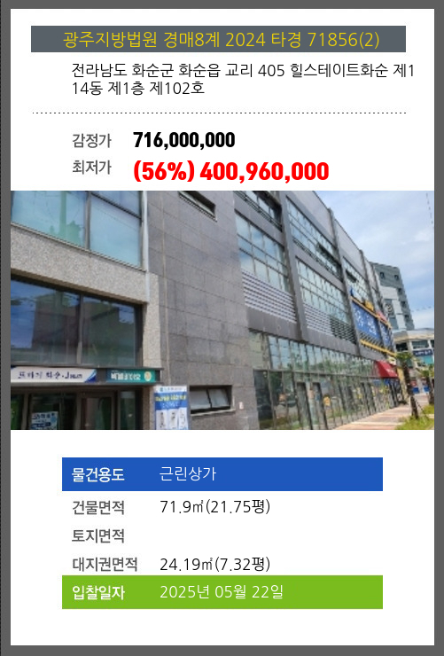 | 건물면적 | 71.9㎡ (21.75평) | 채무자 | ㈜** | 최저가 | (56%) 400,960,000 |