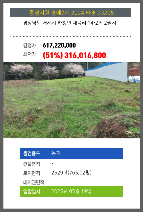 | 용도 | 농지 | 채권자 | 북** | 감정가 | 617,220,000 |