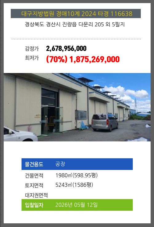 | 건물면적 | 1980㎡ (598.95평) | 채무자 | 최** | 최저가 | (70%) 1,875,269,000 |