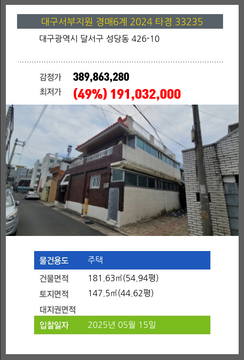 | 건물면적 | 181.63㎡ (54.94평) | 채무자 | 박** | 최저가 | (49%) 191,032,000 |