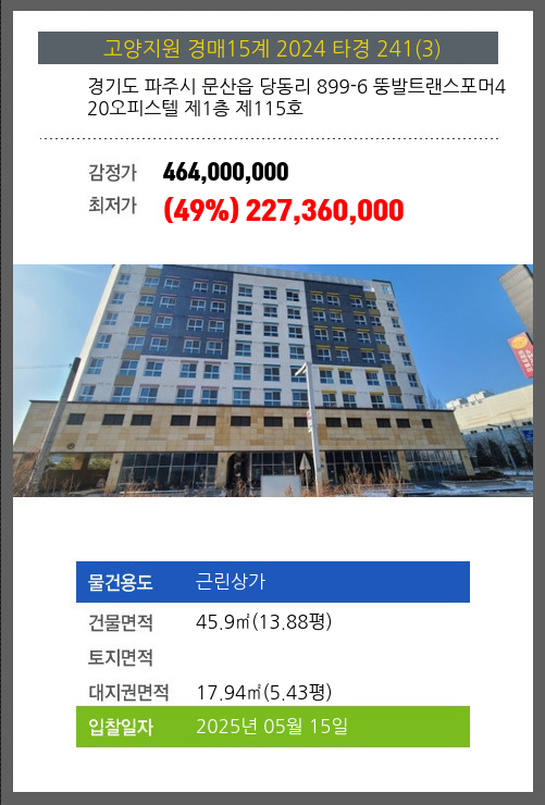 본건은 경기도 파주시 문산읍 당동리 899-6 뚱발트랜스포머420오피스텔 제1층 제115호