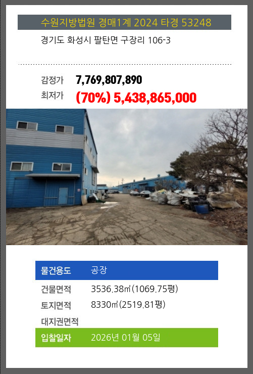 화성공장경매 화성시 팔탄면 구장리 106-3 №2024 타경 53248