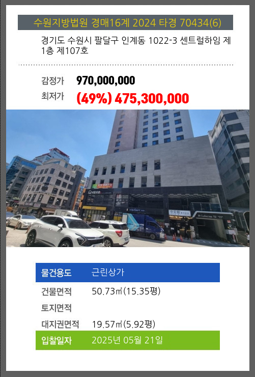 본건은 경기도 수원시 팔달구 인계동 1022-3 센트럴하임 제1층 제107호