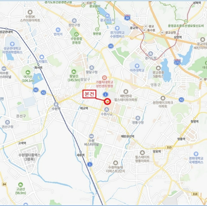 | 소재지 | [지번] 경기도 수원시 팔달구 인계동 1022-3 센트럴하임 제1층 제107호 [도로명 주소] 경기도 수원시 팔달구 인계로108번길 18 센트럴하임 제1층 제107호 |