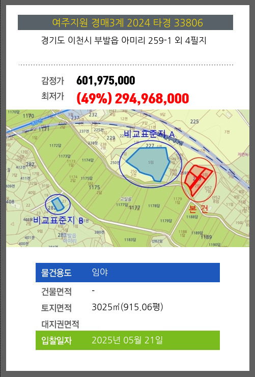 | 토지면적 | 3025㎡ (915.06평) | 소유자 | 이** | 보증금 | (10%) 29,496,800 |