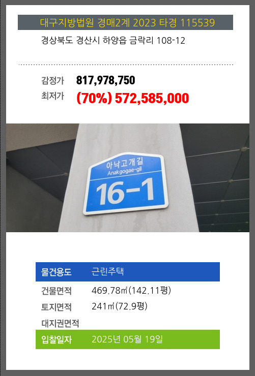 | 용도 | 근린주택 | 채권자 | 경** | 감정가 | 817,978,750 |