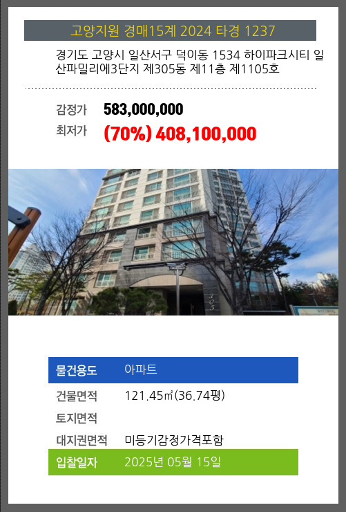 본건은 경기도 고양시 일산서구 덕이동 1534 하이파크시티 일산파밀리에3단지 제305동 제11층 제1105호