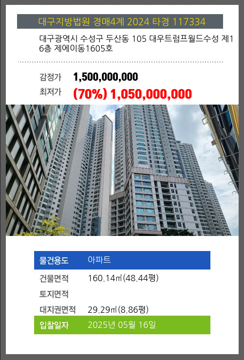 수성아파트경매 수성구 두산동 105 대우트럼프월드수성 제16층 제에이동1605호 №2024 타경 117334
