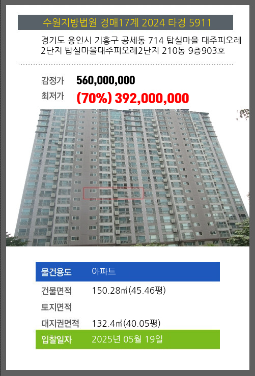 본건은 경기도 용인시 기흥구 공세동 714 탑실마을 대주피오레2단지 탑실마을대주피오레2단지 210동 9층903호