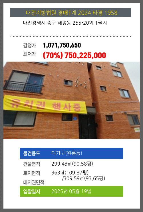 | 매각대상 | 건물전부, 토지지분, 유치권 | 경매종류 | 임의경매 | 사건접수일 | 2024-02-19 |