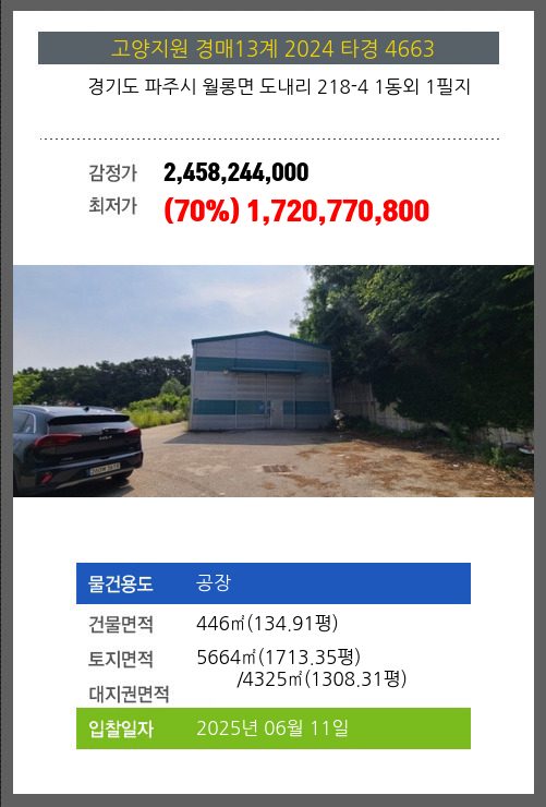 | 소재지 | [지번] 경기도 파주시 월롱면 도내리 218-4 1동외 1필지 [도로명 주소] 경기도 파주시 월롱면 홀작로 70-102 1동 |