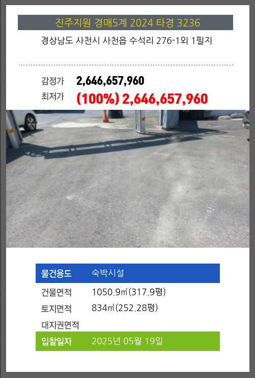 | 용도 | 숙박시설 | 채권자 | 부** | 감정가 | 2,646,657,960 |
