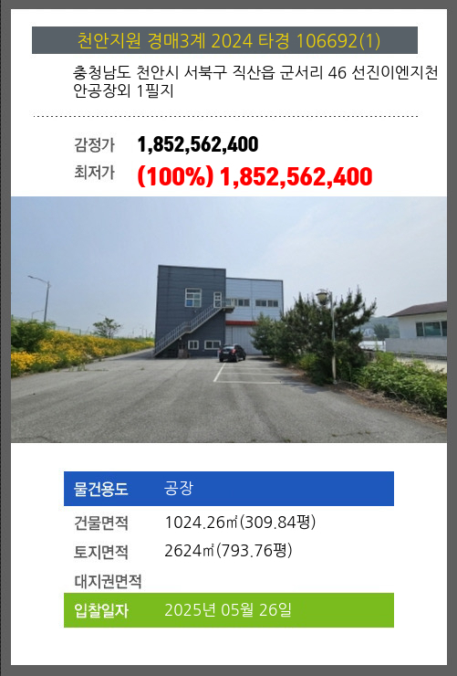 천안공장경매 천안시 서북구 직산읍 군서리 46 선진이엔지천안공장외 1필지 №2024 타경 106692(1)