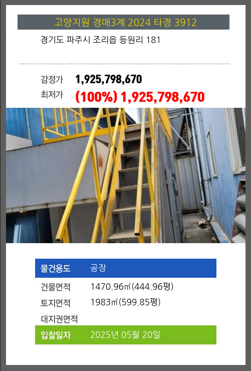 | 용도 | 공장 | 채권자 | 서** | 감정가 | 1,925,798,670 |