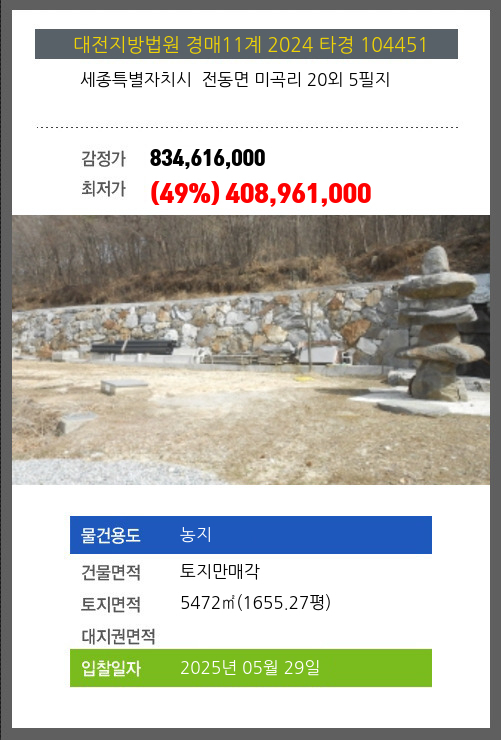 | 소재지 | [지번] 세종특별자치시 전동면 미곡리 20외 5필지 | ||||