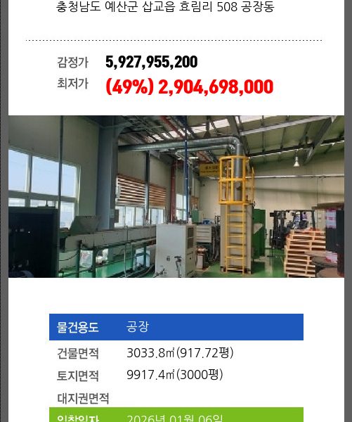 | 건물면적 | 1084.95㎡ (328.2평) | 채무자 | 임** | 최저가 | (49%) 518,809,000 |