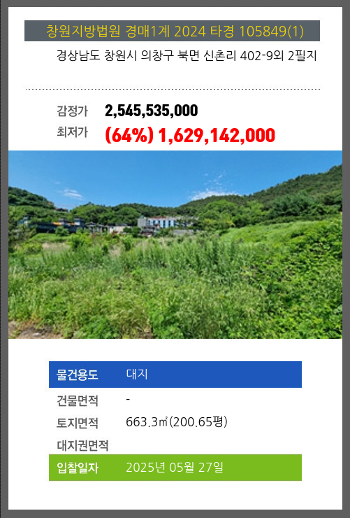 | 소재지 | [지번] 경상남도 창원시 의창구 북면 신촌리 402-9외 2필지 | ||||