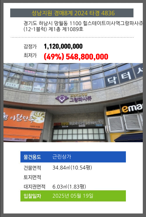 본건은 경기도 하남시 망월동 1100 힐스테이트미사역그랑파사쥬(12-1블럭) 제1층 제1089호