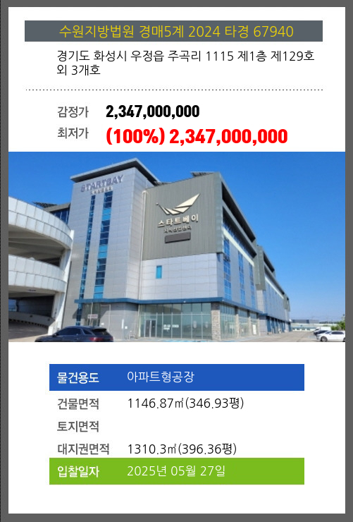 | 용도 | 아파트형공장 | 채권자 | 에** | 감정가 | 2,347,000,000 |