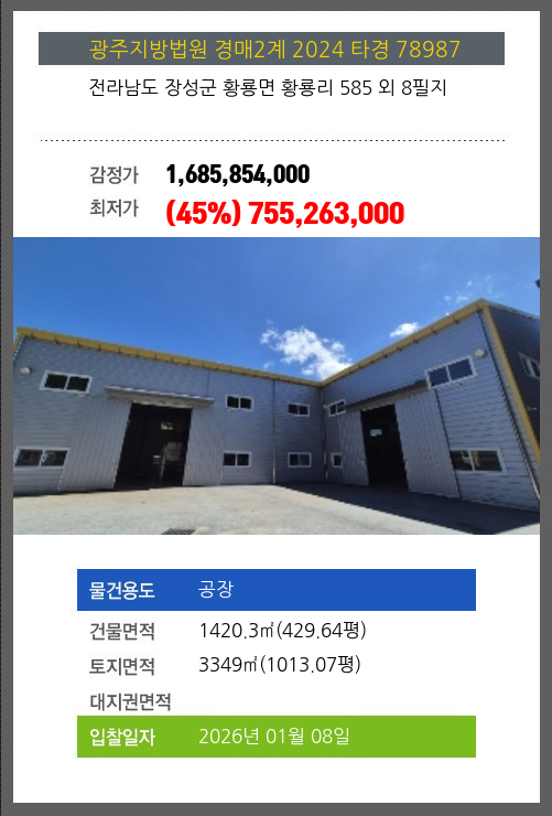 장성공장경매 장성군 황룡면 황룡리 585 외 8필지 №2024 타경 78987