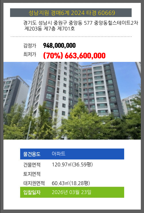 성남아파트경매 성남시 중원구 중앙동 577 중앙동힐스테이트2차 제203동 제7층 제701호 №2024 타경 60669