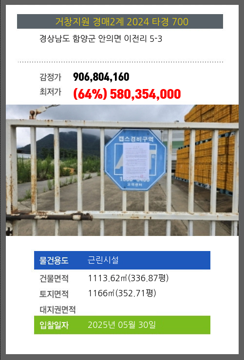 | 건물면적 | 1113.62㎡ (336.87평) | 채무자 | 함** | 최저가 | (64%) 580,354,000 |